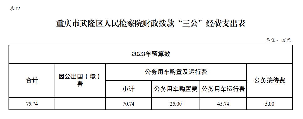 2023年 “三公”经费预算75.74万元,比2022年增加3.47万元,其中:因公出国(境)费用0万元,与2022年持平;公务接待费5万元,与2022年持平;公务用车运行维护费45.74万元,比上年减少3.53万元,主要原因是严格公务用车管理,节约开支;公务用车购置25万元,比上年增加7万元,主要原因是根据实际报废车辆情况选购公务用车。