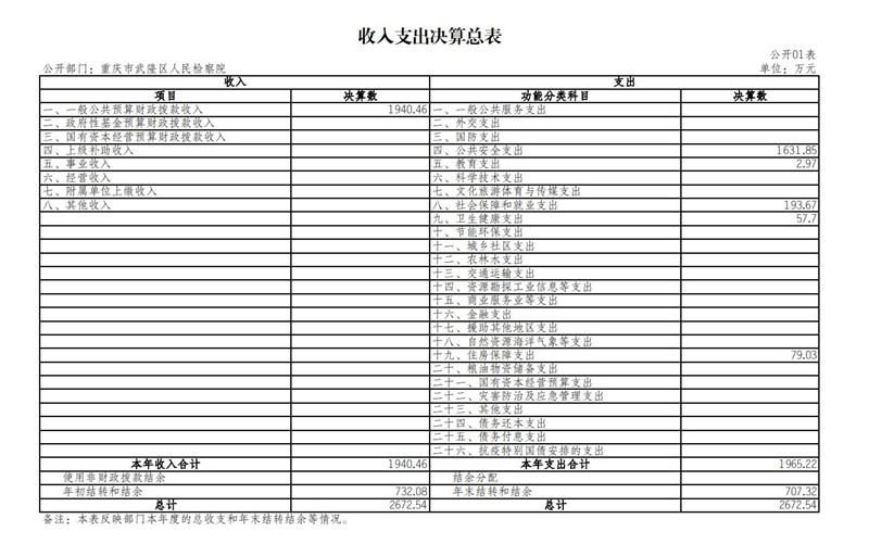 1.总体情况。2022年度收入总计2,672.54万元,支出总计2,672.54万元。收支较上年决算数减少13.53万元,下降0.5%,主要原因是人员经费减少,2022年年末实际在岗干警较2021年较少3人。