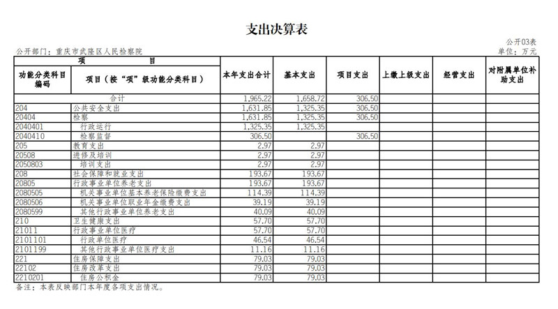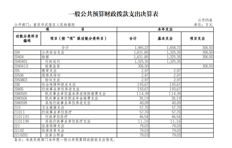 2.支出情况。2022年度一般公共预算财政拨款支出1,965.22万元,较上年决算数增加11.69万元,增长0.6%。主要原因是:一是增拨公务员绩效奖金-基础绩效奖和年度考核奖;二是追加了住房公积金和基本养老保险费;三是年中追加了九次司法救助金。较年初预算数增加213.65万元,增长12.2%。主要原因是:一是增拨公务员绩效奖金-基础绩效奖和年度考核奖;二是追加了住房公积金和基本养老保险费;三是年中追加了九次司法救助金。
