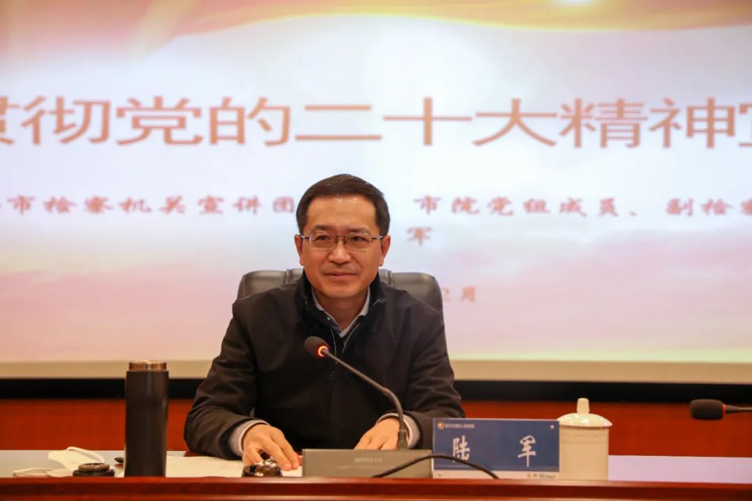 陆军副检察长指出,习近平总书记对学习宣传贯彻二十大精神作出一系列重要指示,突出强调“五个牢牢把握”“三个全面”,为全党全国学习宣传贯彻党的二十大精神指明了方向、树立了标杆。中央、市委和最高检印发了关于认真学习宣传贯彻党的二十大精神的决定或通知,市院也制定下发了指导方案。要认真组织实施,全面掀起学习宣传贯彻党的二十大精神的热潮,切实把思想和行动统一到党的二十大精神上来,把智慧和力量凝聚到党的二十大确定的各项任务上来,做到学在深处、谋在新处、干在实处。
