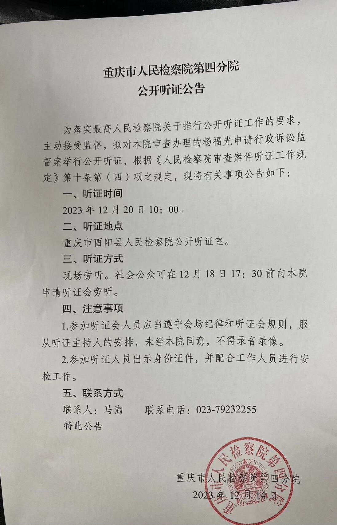 由本院审查办理的杨某与酉阳县某镇人民政府土地权属确认及行政复议一案,定于2023年12月20日10:00在酉阳县人民检察院听证室举行公开听证会。