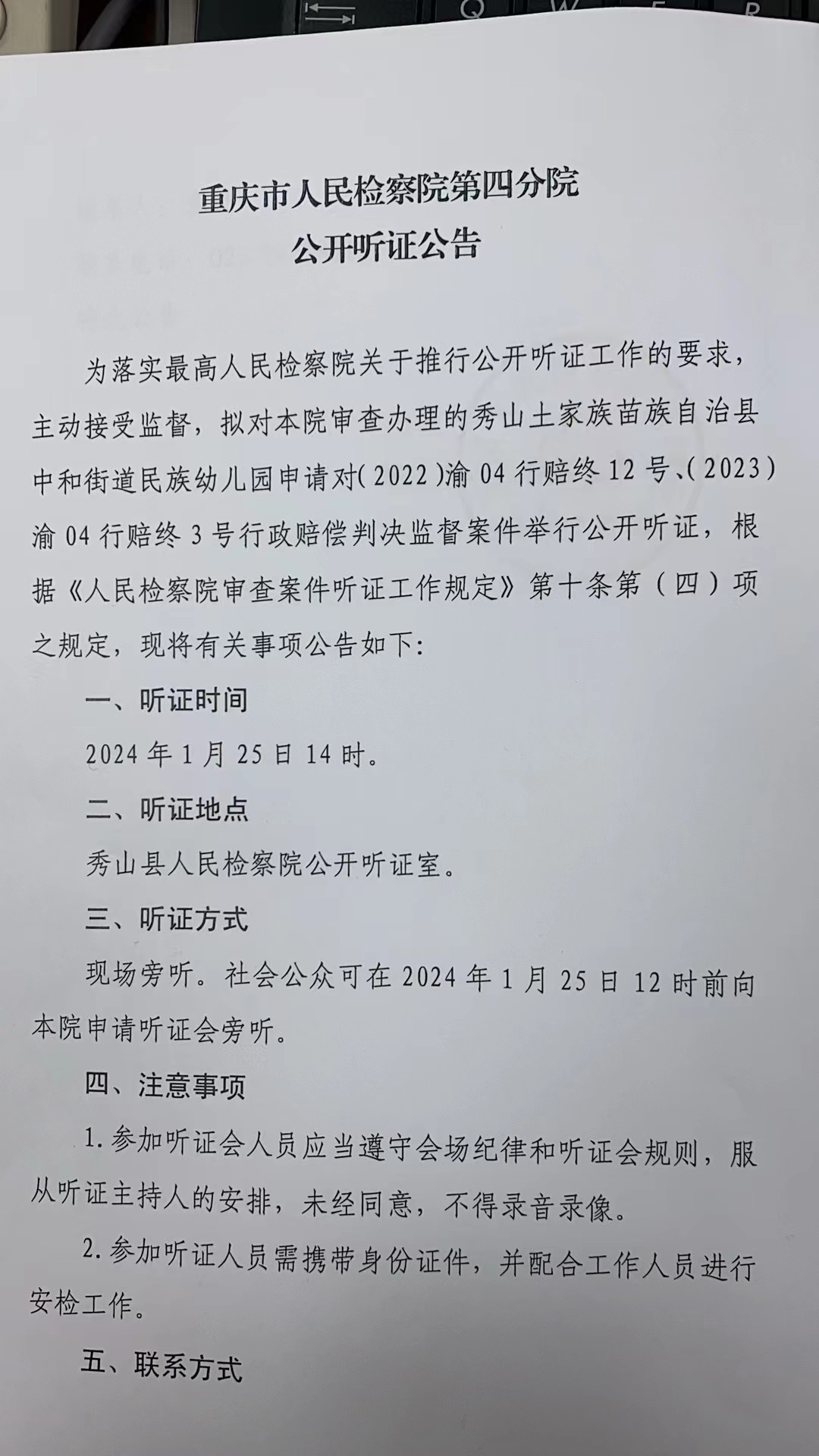 由本院审查办理的秀山某幼儿园行政申诉、行政赔偿诉讼监督一案,定于2024年1月25日14:00在秀山县人民检察院公开听证室举行公开听证会。