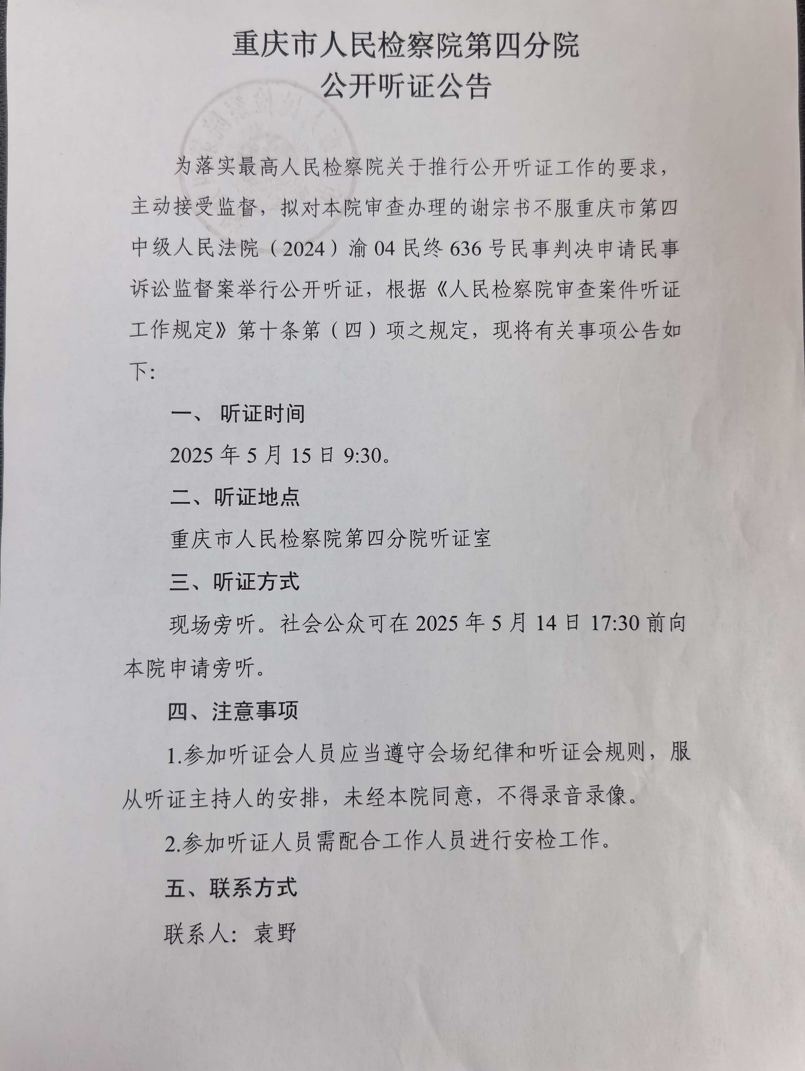 由本院审查办理的谢宗书不服人民法院生效民事判决一案,定于2025年5月15日9:30在188体育(中国)官方网站 第四分院一楼听证室举行公开听证会。