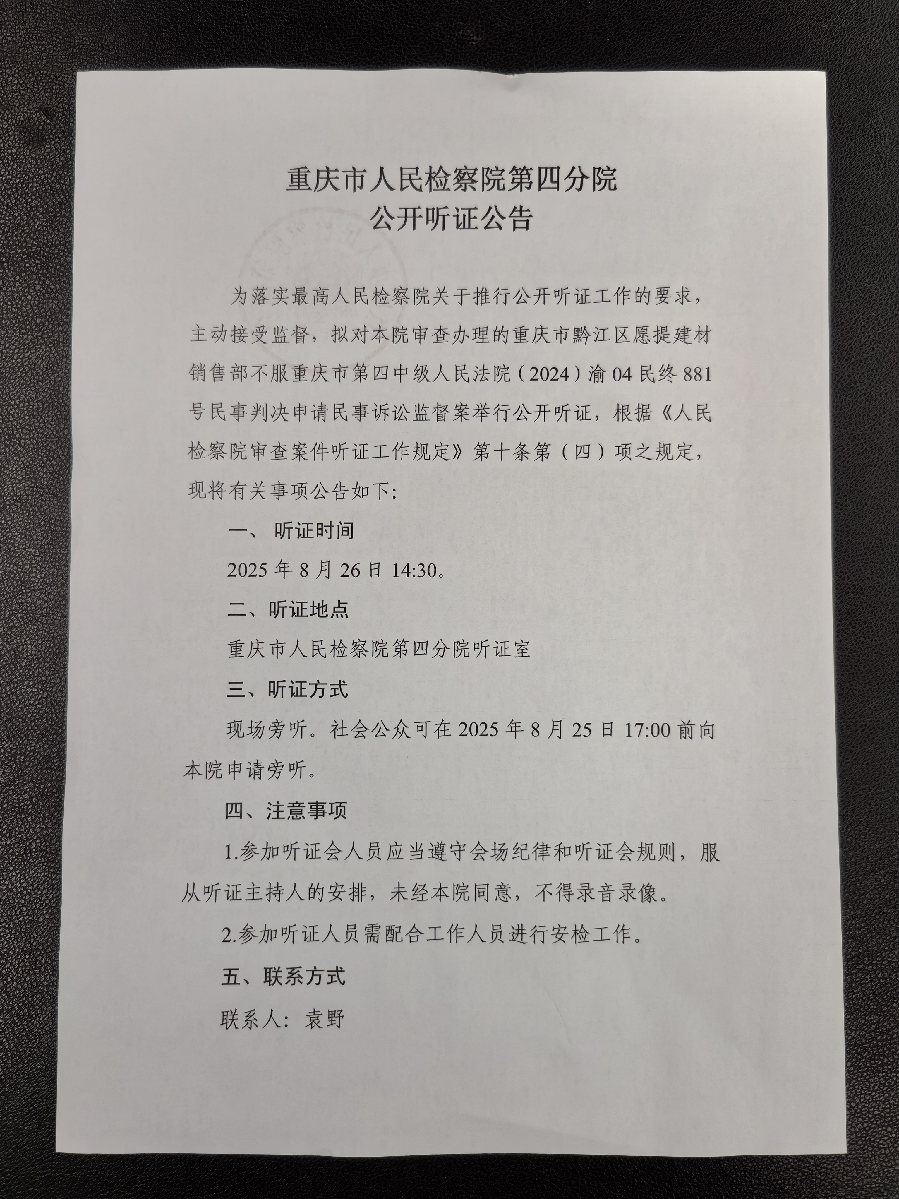 由本院审查办理的重庆市黔江区愿提建材销售部不服重庆市第四中级人民法院民事判决一案,定于2025年8月26日14:30在188体育(中国)官方网站 第四分院一楼听证室举行公开听证会。