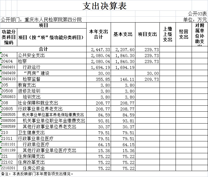 2.支出情况。2020 年度一般公共预算财政拨款支出2,447.33万元,较上年决算数减少142.57万元,下降5.5%。主要原因是今年落实市政府“紧日子十条”规定,政策性压减了一般性项目支出,减少了公车购置经费、培训费等项目经费,清算收回了社保缴费及公积金指标。较年初预算数增加224.81万 元,增长10.1%。主要原因是新增了2019年退休健康休养费、2019年目标绩效奖、退休“中人”一次性退休补贴、房屋及消防设施维修、弥补2020年办案业务费不足等指标。