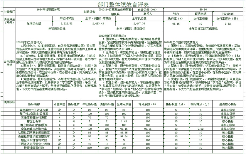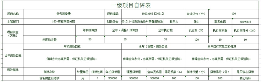 根据预算绩效管理要求,本部门对部门整体和5个一级项目、10个二级项目开展了绩效自评,其中,以填报目标自评表形式开展自评的部门整体绩效1个,涉及资金2493.43万元;一级项目5个,二级项目10个,涉及资金385.85万元。从评价情况来看,总体完成情况较好:一是在强化资金管理做到“三下功夫”。强化组织领导,在提高理念上下功夫;夯实绩效基础,在规范运作上下功夫;注重全程监控,在管理质量上下功夫。二是资金使用上做到“两提升,两提高”。提升了办案经费保障水平,提高了办案效率;提升了办案科技装备的配置,提高了办案水平。三是按照“总额控制、分类核定、以费管人、绩效考核”的原则对聘用人员进行管理,提高办理案件记录、接收、保管、整理、装订案卷材料等工作的效率,减少办案时间、加快办案进度。四是及时对办公楼、消防设施进行维护维修工作,通过劳务和零配件供应商分离的方式有效地控制支出,节约成本。五是按照年度培训目标和上级各部门培训计划安排培训,严格培训费报销标准,不超标超范围报销。