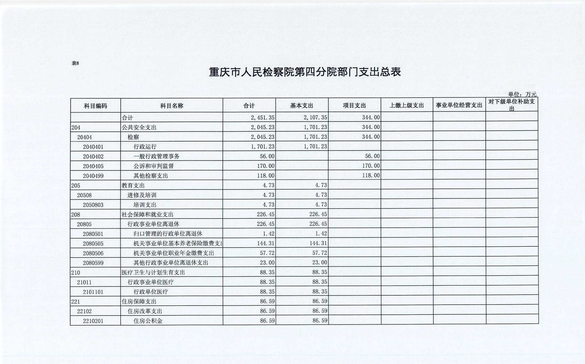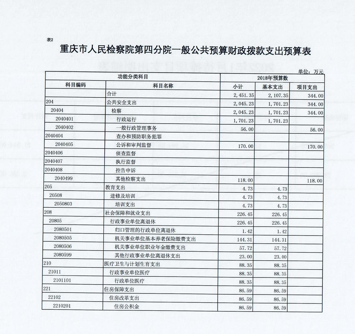 2018年一般公共预算财政拨款收入2451.35万元,一般公共预算财政拨款支出2451.35万元,比2017年增加235.84万元。其中:基本支出2107.35万元,比2017年增加496.54万元,主要原因一是司法体制改革后,新增了员额制绩效考核奖金支出,二是结构性调整,按市上统一要求将项目支出中经常性支出调整到基本支出,如未休假补贴。基本支出主要用于保障在职人员工资福利及社会保险缴费,离休人员离休费及生活补助,保障部门正常运转的办公费、交通费、水电费、印刷费及邮电费等各项商品服务支出;项目支出344万元,比2017年减少260.7 万元,主要原因是支出结构性调整,将项目支出中经常性支出调整到基本支出,如未休假补贴。项目支出主要用于公诉、民行、侦监等办案业务经费保障、装备业务采购及临聘人员工资。