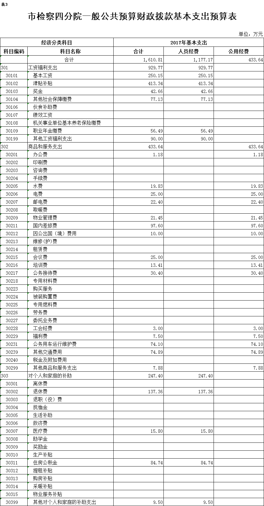 2017年一般公共预算财政拨款收入2215.51万元,一般公共预算财政拨款支出2215.51万元,比2016年增加93.75万元。其中:基本支出1610.81万元,比2016年增加212.05万元,主要原因是人员工资、津贴提标,新增机关事业单位职业年金缴费支出等,主要用于保障在职人员工资福利及社会保险缴费、离退休人员离退休费及生活补助,保障部门正常运转的各项商品服务支出;项目支出604.7万元,比2016年减少118.3万元,主要原因是减少了2016年一次性支出因素。主要用于查办和预防职务犯罪、公诉和审判监督、侦查监督、执行监督、控告申诉等重点工作。