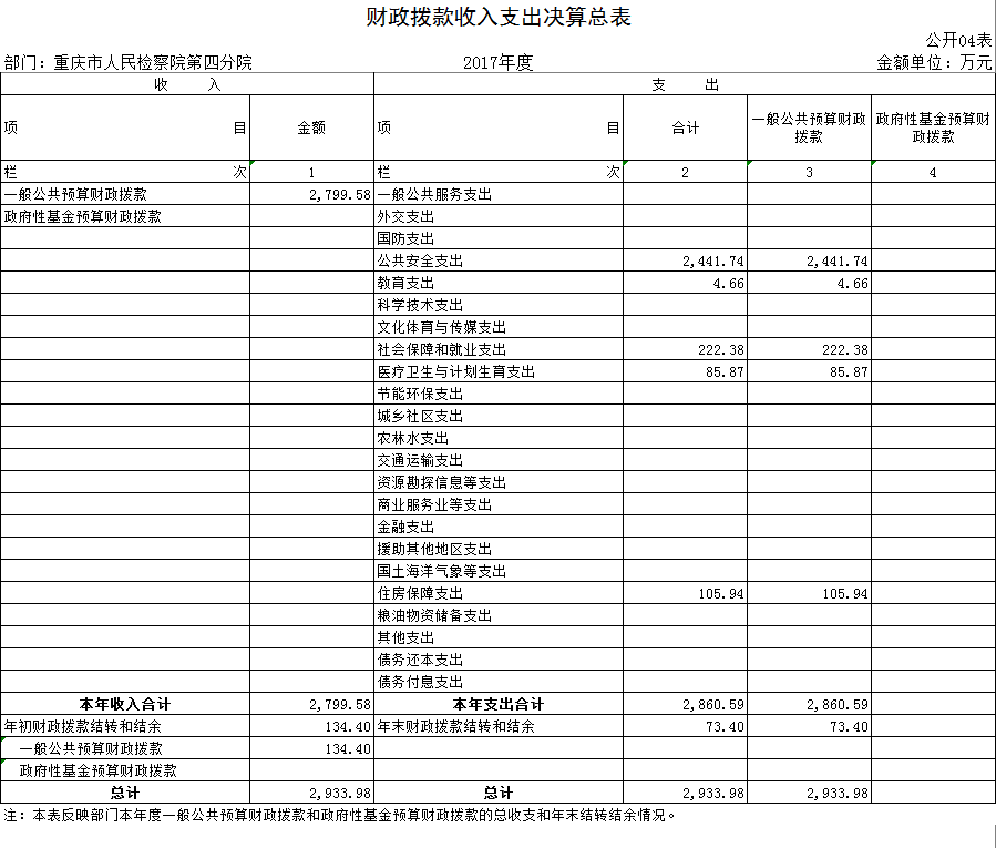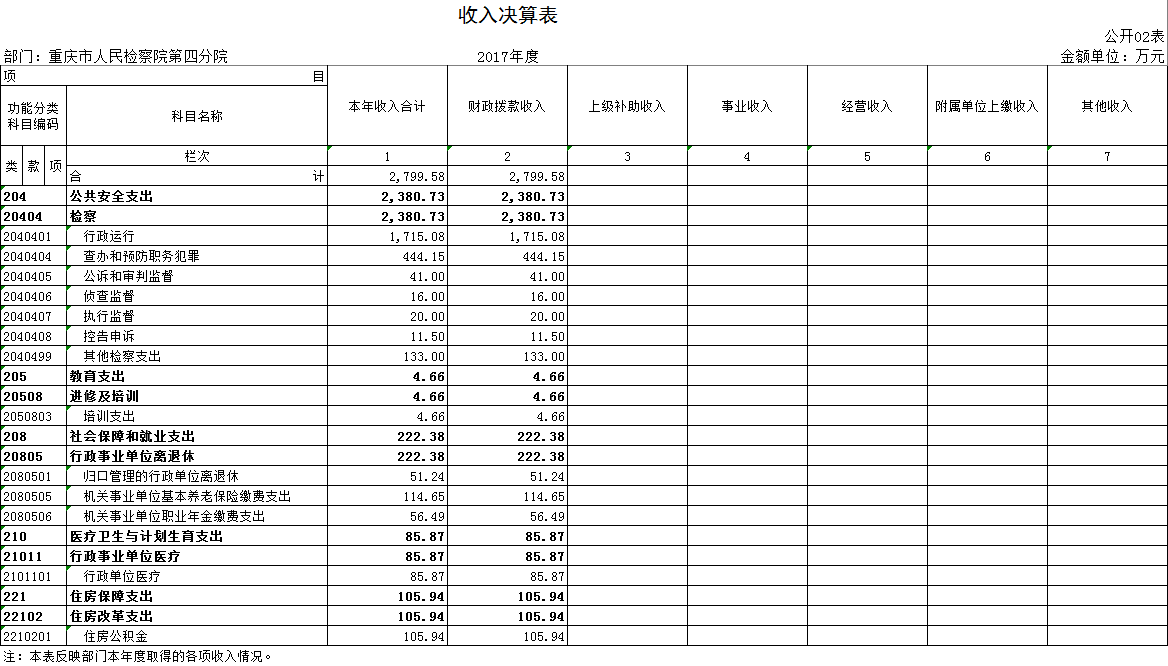 本单位2017年度财政拨款收入2,799.58万元,较上年决算数增加271.85万元,增长10.75%。主要原因是增人增资,新增政策。较年初预算数增加584.07万元,增长26.36%。主要原因是增人增资,新增政策,如:重财行[2017]第000207号下达员额制绩效奖金经费及住房公积金265.9万元;重财行[2017]第000414号下达电子检务工程建设资金60.95万元;重财局[2017]第117085号下达机关事业单位养老保险3-12月单位缴费114.65万元等,政策性增资、津补贴调标等追加142.57万元。