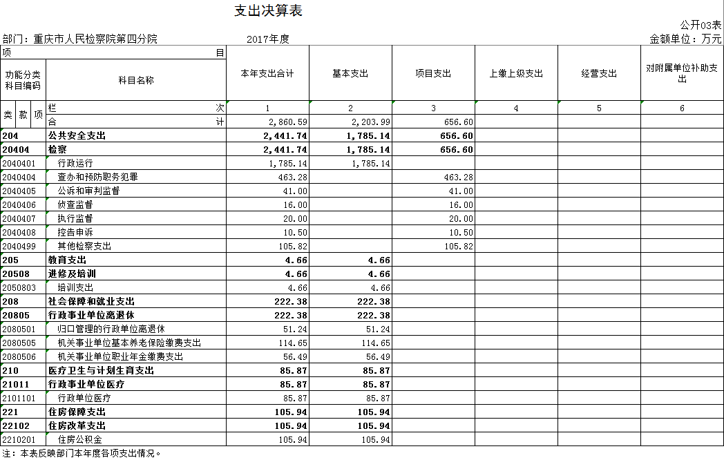 本单位2017年度支出合计2,860.59万元,其中:基本支出2,203.99万元,占77.05%;项目支出656.60万元,占22.95%。