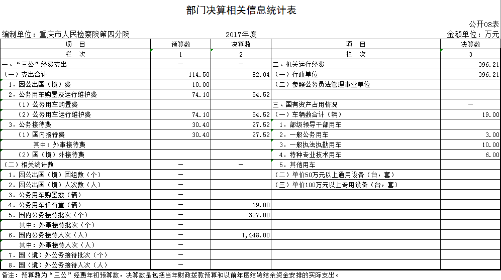 (三)“三公”经费实物量情况。2017年本单位因公出国(境)共计0个团组,0人;公务用车购置0辆,公务车保有量为19辆;国内公务接待327批次,1448人,其中:国内外事接 待0批次,0人;国(境)外公务接待0批次,0人。2017年本单位人均接待费190.04元,车均购置费0.00万元,车均维护费2.87万元。