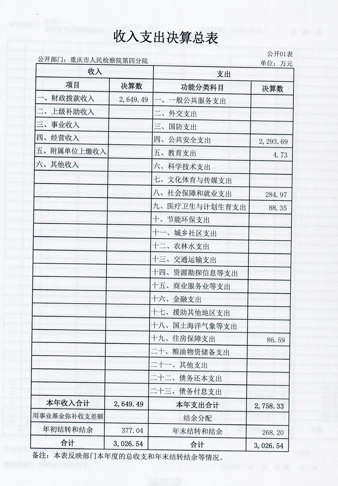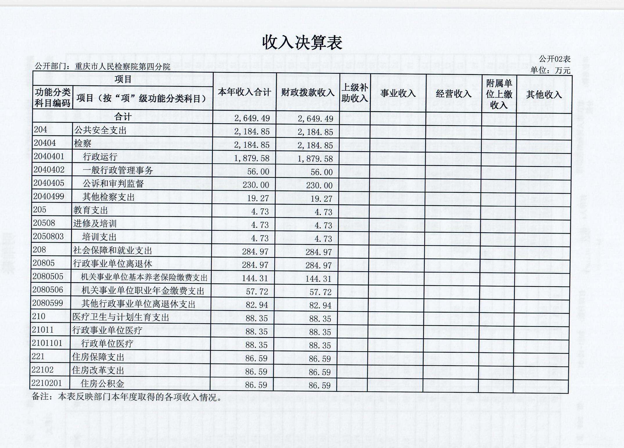 2.收入情况。本单位2018年度收入合计2649.49万元,较上年决算减少150.09万元,下降5.36%,主要原因是根据国家监察体制改革要求,本单位职侦转隶人员划转出12人到市监察委,年中收入指标划转98.73万元到市监察委,人员减少也导致办案经费和油料费、水电费、食堂等公用经费减少。其中:财政拨款收入2649.49万元,占100.00%%。年初结转和结余377.04万元。
