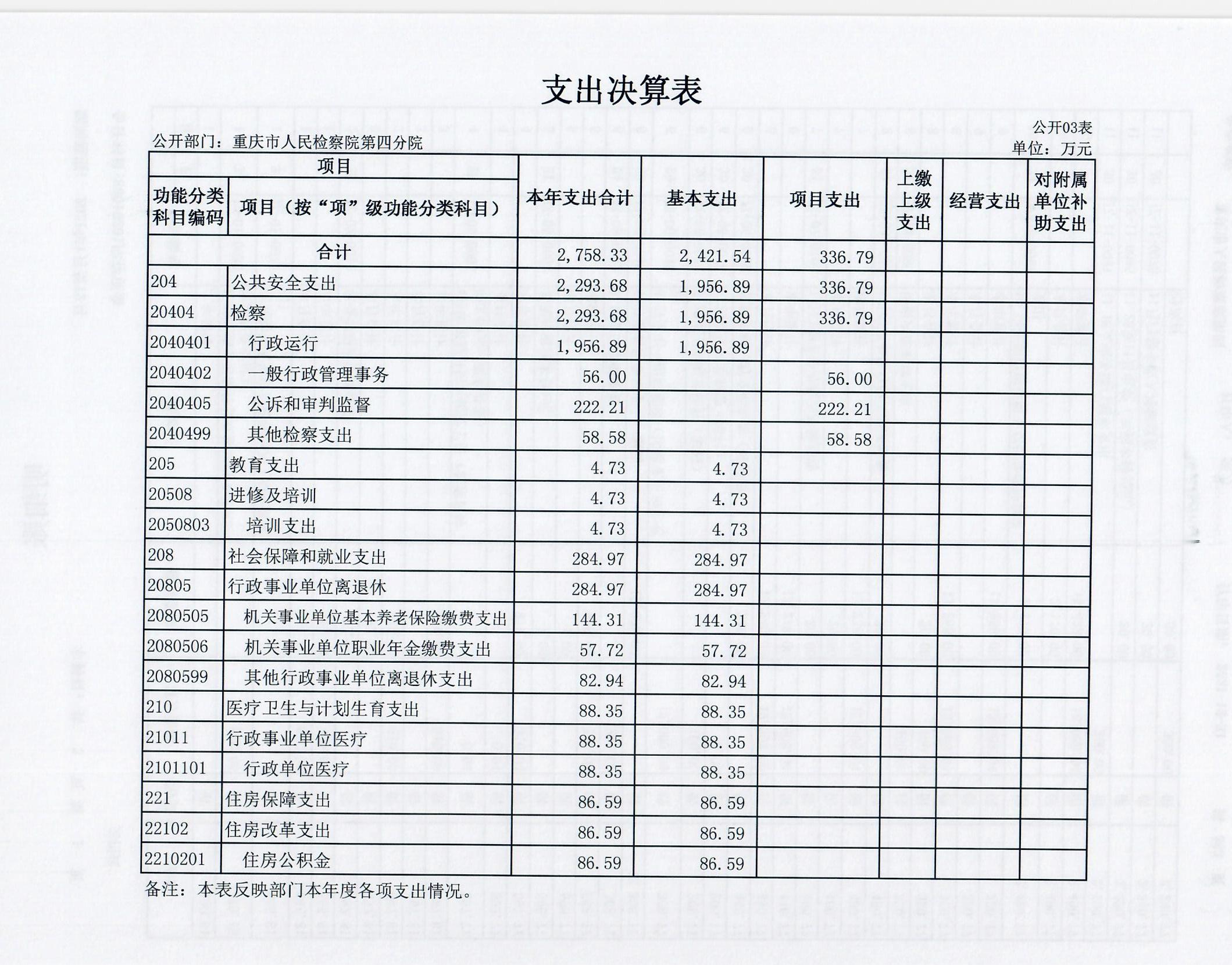 3.支出情况。本单位2018年度支出合计2758.33万元,较上年决算数减少102.26万元,下降3.57%,主要原因是根据国家监察体制改革要求,本单位职侦转隶人员划转出12人到市监察委,年中收入指标划转98.73万元到市监察委,人员减少也导致办案经费和油料费、水电费、食堂等公用经费减少。其中:基本支出2421.54万元,占87.79%;项目支出336.79万元,占12.21%。