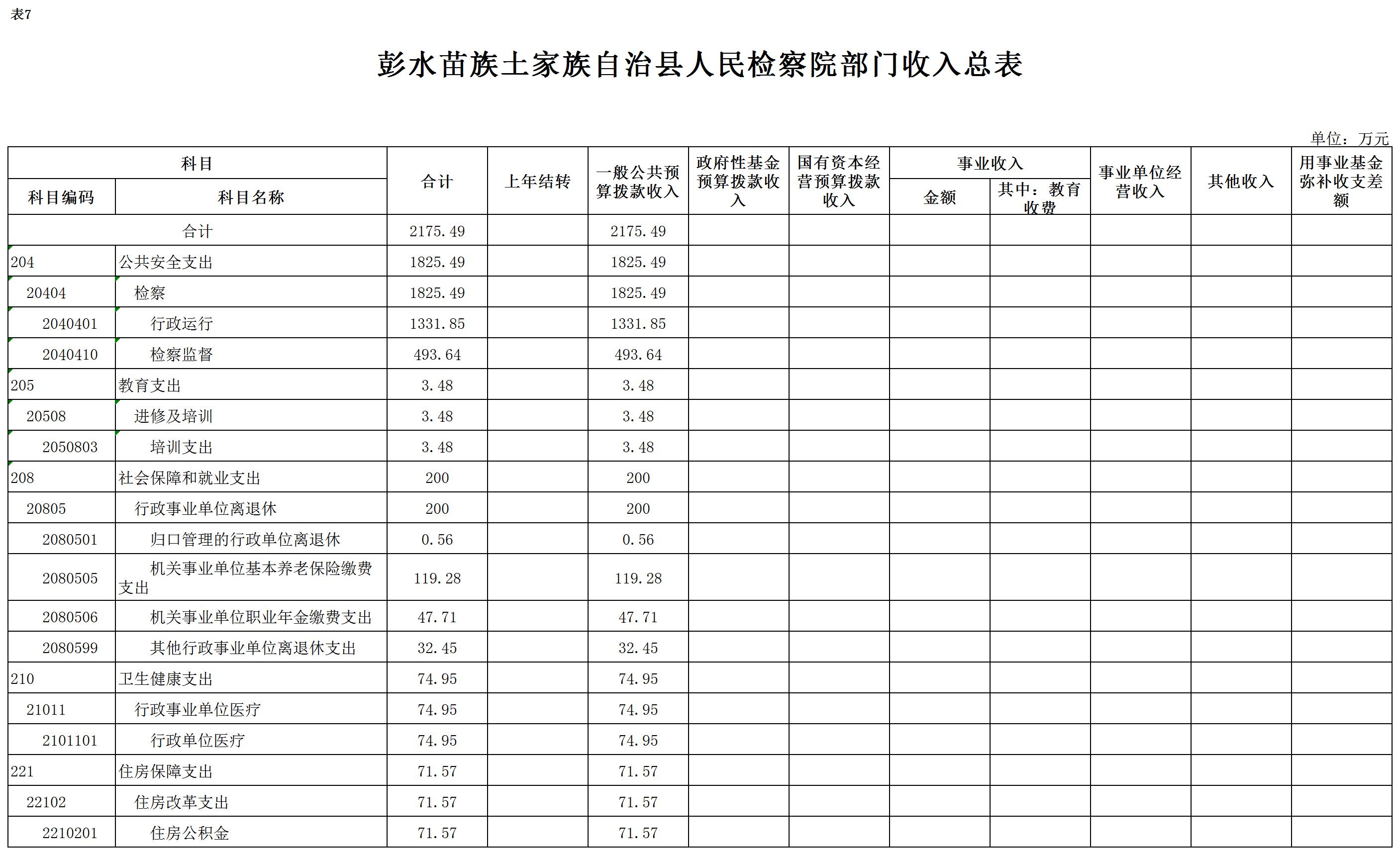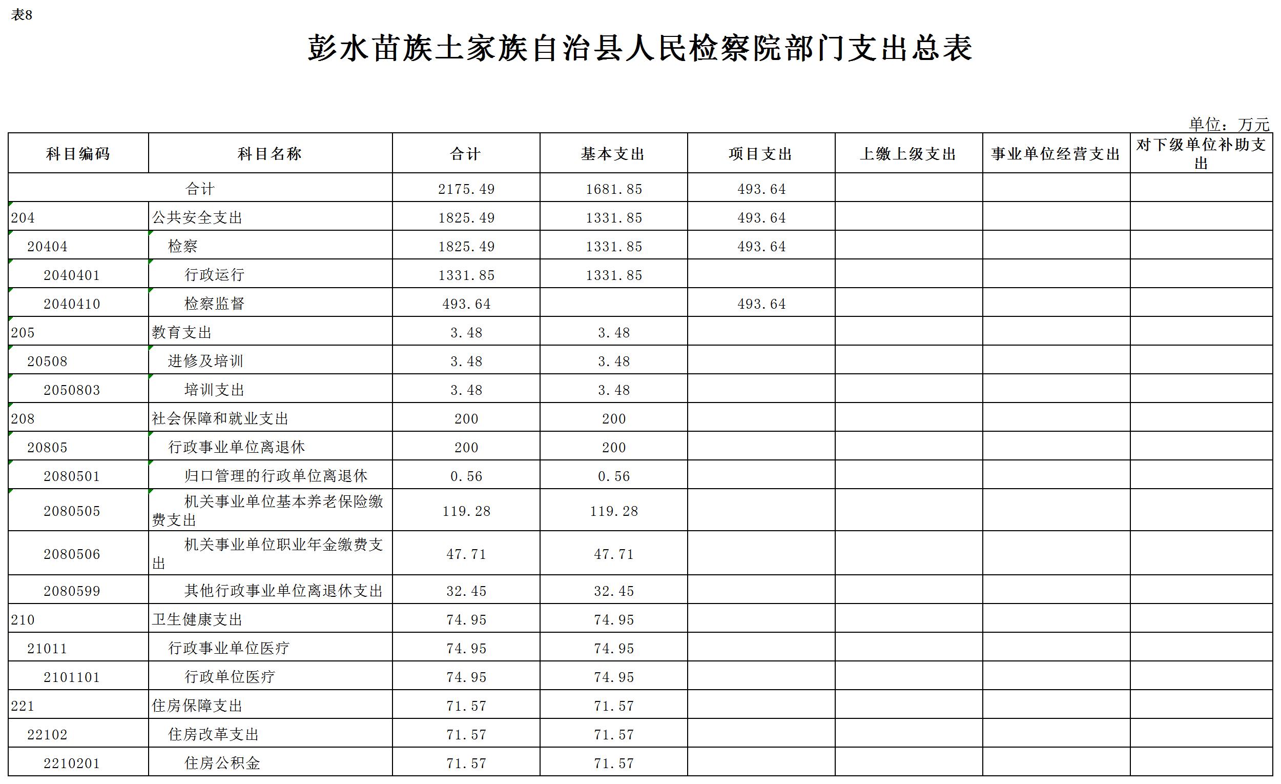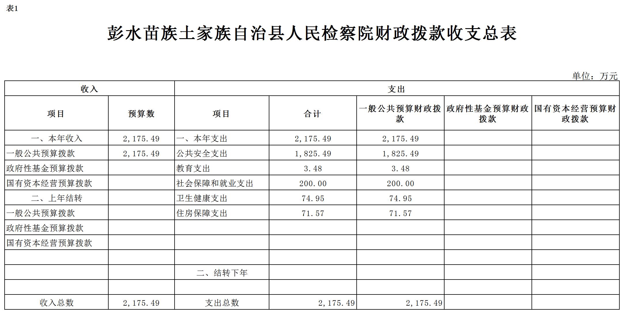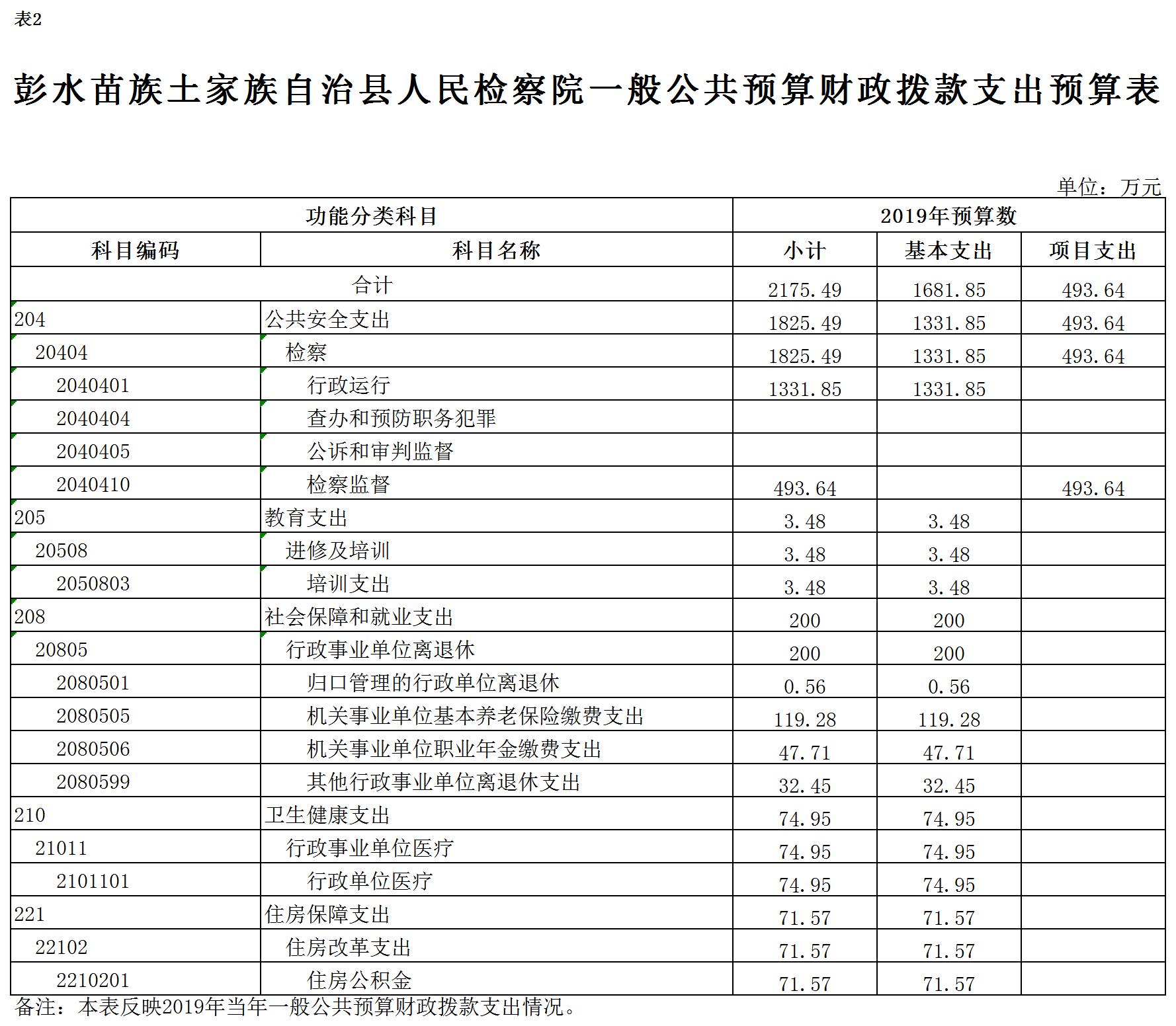 2019年一般公共预算财政拨款收入2175.49万元,一般公共预算财政拨款支出2175.49万元,比2018年增加322.05万元。其中:基本支出1681.85万元,比2018年增加95.61万元,主要原因是政策性人员经费增资,比2018增加133.74万元,国家监察体制改革,职务犯罪侦查局转隶,公用经费比2018减少38.13万元,基本支出总体增加,主要用于保障在职人员工资福利及社会保险缴费,保障部门正常运转的各项商品服务支出;项目支出493.64万元,比2018年增加226.44万元,主要原因:一是增加信息化建设项目资金,主要用于我院新办公楼弱电智能化工程建设,属一次性项目;二是增加公益诉讼专项经费,用于办案业务及重点工作支出。