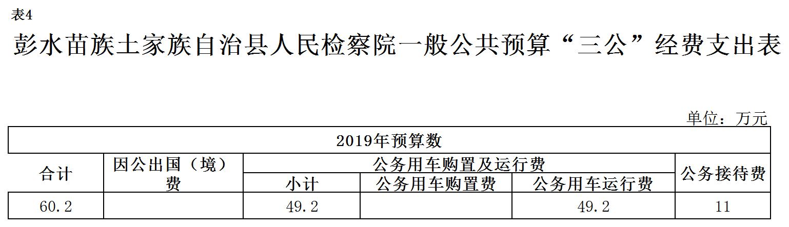 2019年“三公”经费预算60.2万元,比2018年减少12.3万元。其中:因公出国(境)费用0万元,与2018年持平;公务接待费11万元,与2018年持平;公务用车运行维护费49.2万元,比2018年减少12.3万元,主要原因是我院职务犯罪侦查局转隶,划转车辆3辆,实有车辆减少;公务用车购置费0万元,与2018年持平。