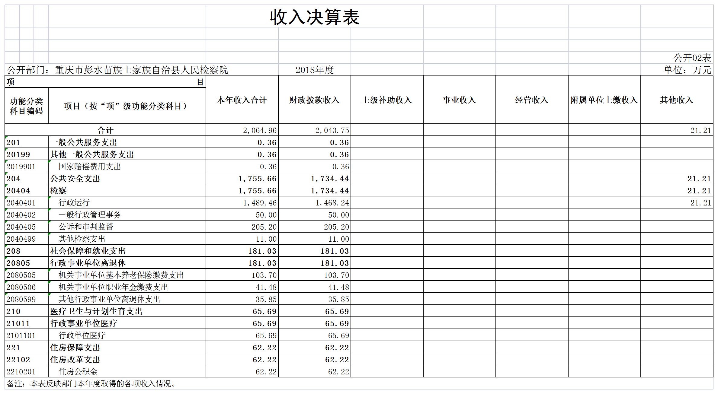 2.收入情况。本部门2018年度收入合计2,064.96万元,较上年决算减少261.13万元,下降11.23%,主要原因是国家监察体制改革,职务犯罪侦查局转隶,收入减少。其中:财政拨款收入2,043.75万元,占98.97%;其他收入21.21万元,占1.03%。此外,年初结转和结余125.24万元。
