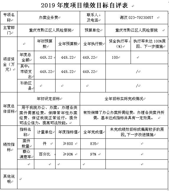 根据预算绩效管理要求,本部门对3个项目开展了绩效自评,其中,以填报目标自评表形式开展自评1项,涉及资金449.22万元;从评价情况来看采取了积极有效的措施,达到了绩效目标,有效保证了本单位正常运行,提高了办案水平。