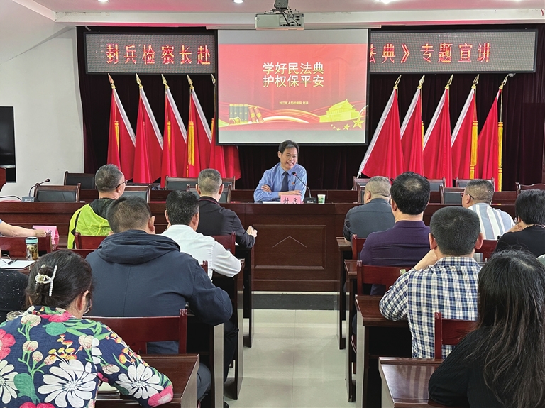 6月6日,黔江区人民检察院党组书记、检察长封兵受邀走进正阳街道,开展《民法典》专题宣讲活动。正阳街道全体干部职工以及社区干部聆听宣讲。