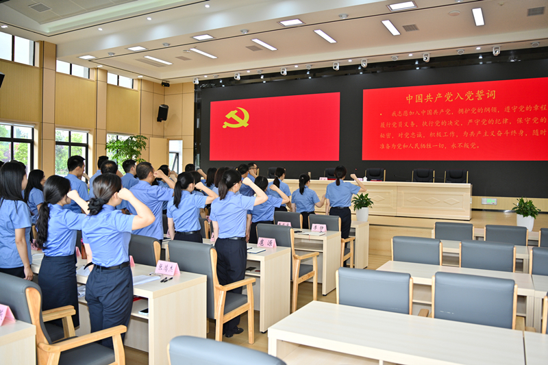 会议在庄严的国歌声中拉开序幕,彭波检察长带领全体党员干警重温入党誓词。