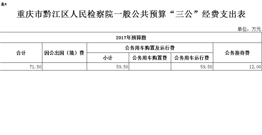 2017年“三公”经费预算71.5万元,比2016年减少10.5万元。其中:因公出国(境)费用0万元,与2016年持平;公务接待费12万元,比2016年减少20万元;公务用车运行维护费59.5万元,比2016年增加9.5万元;公务用车购置费0万元,与2016年持平。主要原因是我单位严格执行八项规定,压缩公务接待规模和次数,公务接待支出逐年下降;单位车辆使用年限较长,维修费用较高。