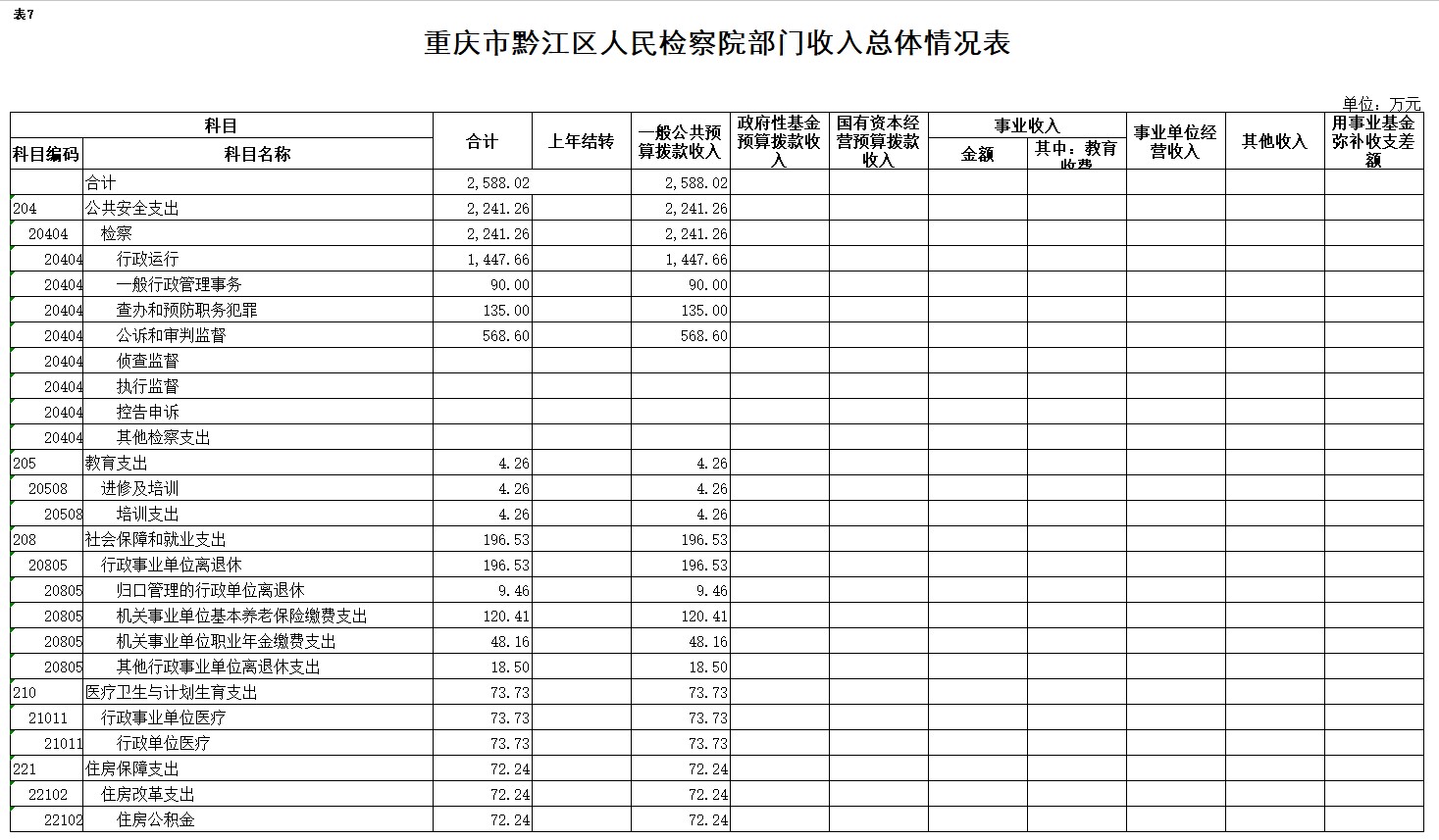 一、单位基本情况 重庆市黔江区人民检察院是国家的法律监督机关,内设三局三部两室,行使国家的检察权,主要职能是:受理单位和个人的报案、控告、申诉、举报以及犯罪嫌疑人的自首;依法对贪污贿赂犯罪案件、国家工作人员渎职犯罪案件和国家机关工作人员利用职权实施的非法拘禁、刑讯逼供、报复陷害、非法搜查的侵犯公民人身权利与侵犯公民民主权利的犯罪案件进行侦查;依法对刑事诉讼、民事审判和行政诉讼实行法律监督工作;依法对执行机关执行罪罚的活动是否合法实行监督;对法院已经发生法律效力、确有错误的判决和裁定,依法提请抗诉。 二、部门预算情况说明 2018年一般公共预算财政拨款收入2588.02万元,一般公共预算财政拨款支出2588.02万元,比2017年减少50.12万元。其中:基本支出1794.42万元,比2017年增加78.04万元,主要原因是支出结构调整后,将原项目支出列支的事项调整到基本支出,主要用于保障在职人员工资福利及社会保险缴费,离休人员离休费及生活补助,保障部门正常运转的办公费及印刷费、邮电费等各项商品服务支出;项目支出793.6万元,比2017年减少128.16万元,支出结构调整后,将原项目支出列支的事项调整到基本支出,主要用于公诉和审判监督、侦查监督、执行监督、控告申诉、检察室运行、环保资源类案件集中办理等重点工作。 重庆市黔江区人民检察院2018年没有使用政府性基金预算拨款安排的支出。 三、“三公”经费情况说明 2018年“三公”经费预算107.9万元,比2017年减少增加36.4万元。其中:因公出国(境)费用0万元,与2017年持平;公务接待费12万元,与2017年持平;公务用车运行维护费77.9万元,比2017年增加18.4万元,主要原因是调整公务用车运行维护费标准;公务用车购置费18万元,比2017年增加18万元,主要原因是我单位有三辆执法执勤用车使用年限较长,已达到报废标准,因办案需要购置更换执法执勤用车一辆。 四、其他重要事项的情况说明 1、机关运行经费情况。2018年一般公共预算财政拨款运行经费526.55万元,比上年增加130.79万元,主要原因为市级部门公用经费标准统一提高。主要用于办公费、印刷费、邮电费、水电费、物管费、差旅费、会议费、培训费及其他商品和服务支出等。 2、政府采购情况。2018年政府采购预算总额90万元,其中:政府采购货物预算90万元。 3、绩效目标设置情况。2018年项目支出均实行了绩效目标管理,涉及一般公共预算当年财政拨款793.6万元。 五、专业性名词解释 (一)财政拨款收入:指本年度从本级财政部门取得的财政拨款,包括一般公共预算财政拨款和政府性基金预算财政拨款。 (二)基本支出:指为保障机构正常运转、完成日常工作任务而发生的人员经费和公用经费。 (三)项目支出:指在基本支出之外为完成特定行政任务和事业发展目标所发生的支出。 (四)“三公”经费:指用一般公共预算财政拨款安排的因公出国(境)费、公务用车购置及运行维护费、公务接待费。其中,因公出国(境)费反映单位公务出国(境)的国际旅费、国外城市间交通费、住宿费、伙食费、培训费、公杂费等支出;公务用车购置费反映单位公务用车购置支出(含车辆购置税);公务用车运行维护费反映单位按规定保留的公务用车燃料费、维修费、过路过桥费、保险费、安全奖励费用等支出;公务接待费反映单位按规定开支的各类公务接待(含外宾接待)支出。