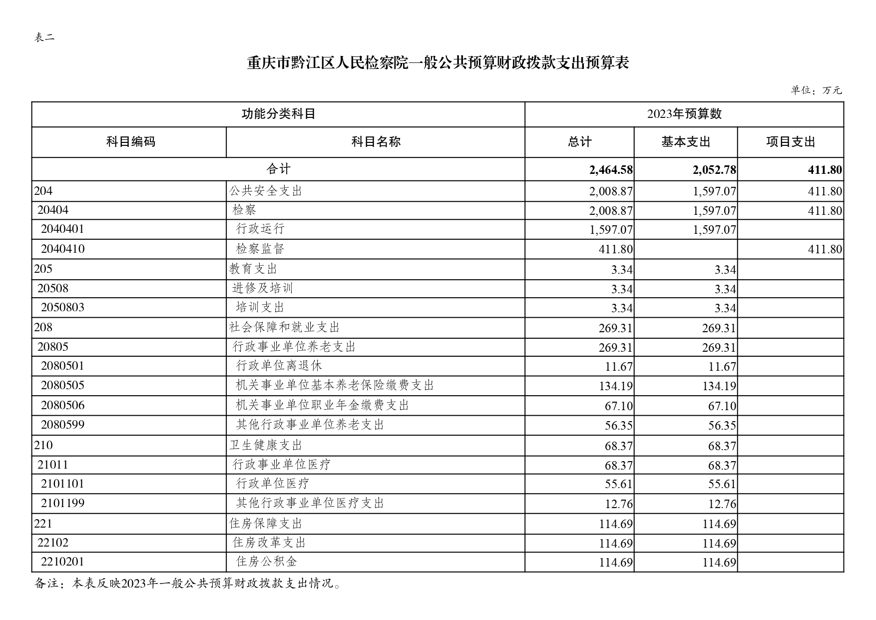 (二)支出预算:2023年年初预算数2464.58万元,其中:公共安全支出2008.87万元,教育支出3.34万元,社会保障和就业支出269.31万元,卫生健康支出68.37万元,住房保障支出114.69万元。支出预算较上年增加327.01万元,主要是基本支出预算增加392.25万元,项目支出预算减少65.24万元。