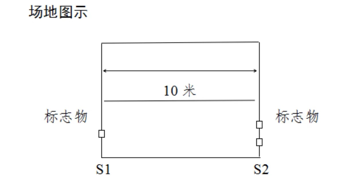 动作要求:受测试者采用站立式起跑,听到发令后从S1线外跑到S2线前(脚不得踩线)用手将竖立的木块推倒后折返,往返跑2次,每次推倒1个木块,第2次返回时冲出S1线。