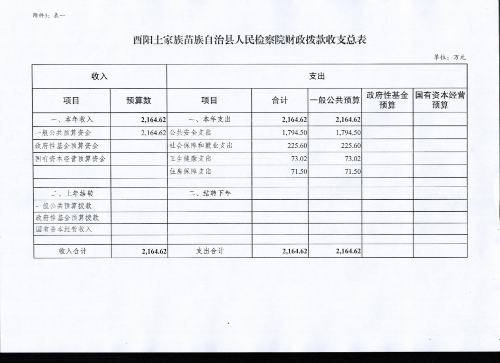 一、单位基本情况 (一)职能职责 酉阳土家族苗族自治县人民检察院是国家法律监督机关,依照法律规定在辖区范围内对有关刑事案件行使侦查权;对刑事案件进行审查,批准或者决定是否逮捕犯罪嫌疑人;对刑事案件进行审查,对决定提起公诉的案件支持公诉;依照法律规定提起公益诉讼;对诉讼活动实行法律监督;对判决、裁定等生效法律文书的执行工作实行法律监督;对看守所的执法活动实行法律监督;法律规定的其他职权。 (二)单位构成 本单位设置了检察一部、检察二部、检察三部、检察四部、检察五部、检察六部、政治部、办公室及龙潭检察室。 二、部门收支总体情况 (一)收入预算:2022年年初预算数2164.62万元,其中:一般公共预算拨款2164.62万元,政府性基金预算拨款0万元,国有资本经营预算收入0万元,事业收入0万元,事业单位经营收入0万元,其他收入0万元;收入较去年增加161.62万元,主要是一般公共预算拨款增加161.62万元。 (二)支出预算:2022年年初预算数2164.62万元,其中:一般公共安全支出支出1794.50万元,教育支出0万元,社会保障和就业支出225.60万元,卫生健康支出73.02万元,住房保障支出71.50万元;支出较去年增加161.62万元,主要是基本支出增加95.66万元,项目支出增加65.96万元。 三、部门预算情况说明 2022年一般公共预算财政拨款收入2164.62万元,一般公共预算财政拨款支出2164.62万元,比上年增加161.62万元,其中:基本支出1730.66万元,比上年增加95.66元,主要原因是人员增加及政策性增资,主要用于保障在职人员工资福利及社会保险缴费,退休人员补助等,保障部门正常运转的各项商品服务支出;项目支出433.96万元,比上年增加65.96万元,主要原因是新建智慧案管大厅,主要用于提升检察案管大厅信息化水平,提高接访质量。 酉阳土家族苗族自治县人民检察院2022年未使用政府性基金预算拨款安排的支出,与上年保持一致。 四、“三公”经费情况说明 2022年“三公”经费预算51万元,比上年减少12万元,其中:因公出国(境)费用0万元,比上年增加0万元,主要原因是2022年未安排因公出境事宜;公务接待费3万元,比上年减少12万元,主要原因是落实中央过紧日子要求,严格规范控制公务接待费;公务用车运行维护费48万元,比上年增加0万元,主要原因是2022年未新增公务用车,公务用车运行维护费保持不变;公务用车购置0万元,比上年增加0万元,主要原因是2022年,机关公务车仍在使用年限内,无新购车辆安排。 五、其他重要事项的情况说明 1.机关运行经费。2022年一般公共预算财政拨款运行经费475.81万元,比上年增加19.31万元,主要原因为单位在编人员变动。主要用于办公费、印刷费、邮电费、物管费、差旅费、会议费、培训费及其他商品和服务支出等。 2.政府采购情况。所属各预算单位政府采购预算总额0万元,其中:政府采购货物预算0万元,政府采购工程预算0万元,政府采购服务预算0万元。一般公共预算拨款政府采购0万元,其中:政府采购货物预算0万元,政府采购工程预算0万元,政府采购服务预算0万元。 3.绩效目标设置情况。2022年项目支出均实行了绩效目标管理,涉及一般公共预算当年财政拨款433.96万元。 4.国有资产占有使用情况。截止2021年12月,所属各预算单位共有车辆12辆,其中一般公务用车0辆、执勤执法用车12辆,2022年一般公共预算安排购置车辆0辆,其中一般公务用车0辆,执法执勤用车0辆。 六、专业性名词解释 (一)财政拨款收入:指本年度从本级财政部门取得的财政拨款,包括一般公共预算财政拨款和政府性基金预算财政拨款。 (二)其他收入:指单位取得的除“财政拨款收入”、“事业收入”、“经营收入”等以外的收入。 (三)基本支出:指为保障机构正常运转、完成日常工作任务而发生的人员经费和公用经费。 (四)项目支出:指在基本支出之外为完成特定行政任务和事业发展目标所发生的支出。 (五)“三公”经费:指用一般公共预算财政拨款安排的因公出国(境)费、公务用车购置及运行维护费、公务接待费。其中,因公出国(境)费反映单位公务出国(境)的国际旅费、国外城市间交通费、住宿费、伙食费、培训费、公杂费等支出;公务用车购置费反映单位公务用车购置支出(含车辆购置税);公务用车运行维护费反映单位按规定保留的公务用车燃料费、维修费、过路过桥费、保险费、安全奖励费用等支出;公务接待费反映单位按规定开支的各类公务接待(含外宾接待)支出。 单位预算公开联系人:张浥通 联系方式:023-75532685