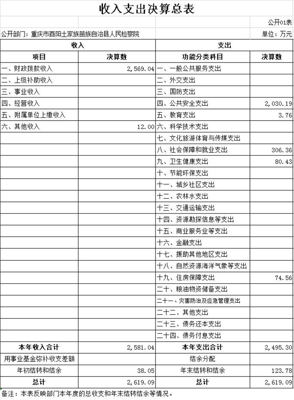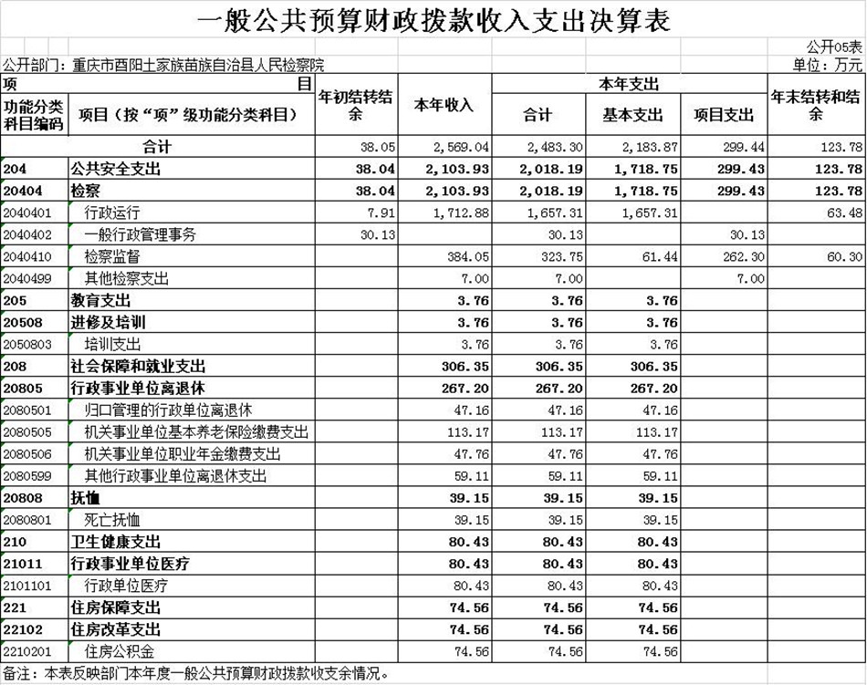 1.收入情况。2019年度一般公共预算财政拨款收入2,569.04万元,较上年决算数增加234.39万元,增长10.0%,主要原因是政策性增资及政府目标奖的及时发放。较年初预算数增加402.61万元,增长18.6%,主要原因是年中追加政府目标奖、退休休养费、退休干警死亡抚恤金、司法救助金、办案业务费等。此外,年初财政拨款结转和结余38.05万元。