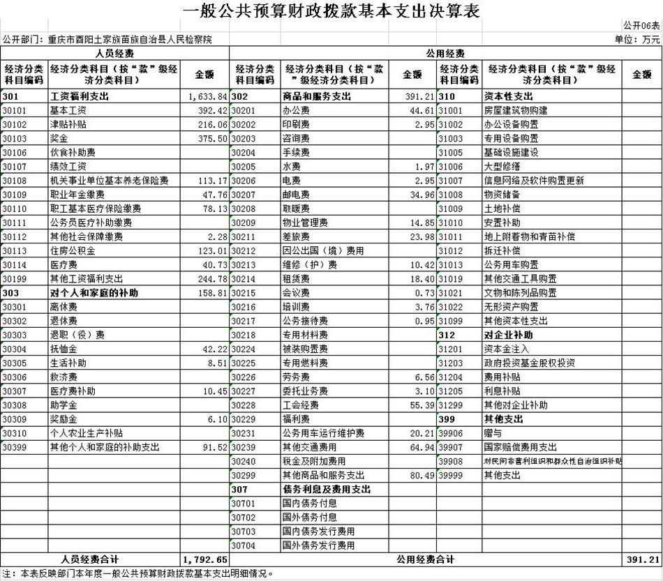 2019年度一般公共财政拨款基本支出2,183.87万元。其中:人员经费1,792.65万元,较上年决算数增加218.51万元,增长13.9%,主要原因一是人员政策性增资,二是发放2名退休干警死亡抚恤金。人员经费用途主要包括基本工资、津贴补贴、奖金、社会保障缴费、住房公积金、医疗费、抚恤金、医疗费补助、其他对个人和家庭的补助等。公用经费391.21万元,较上年决算数减少95.73万元,下降19.7%,主要原因是厉行节约,贯彻政府过紧日子的政策,严格控制单位各项开支。公用经费用途主要包括办公费、印刷费、水费、电费、邮电费、物业管理费、差旅费、维修(护)费、租赁费、培训费、劳务费、公务用车运行维护费、其他交通费用、其他商品和服务支出等。