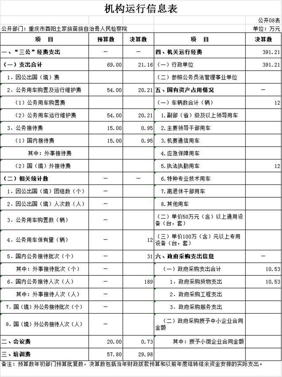 此外,本年度一般公共预算财政拨款会议费支出0.73万元,较上年决算数减少0.51万元,下降41.1%,主要原因是本年未召开大型会议。本年度一般公共预算财政拨款培训费支出29.98万元,较上年决算数增加1.48万元,增长5.2%,主要原因是上级部门重视人才综合素质培训,定期组织各条线干警进行培训。