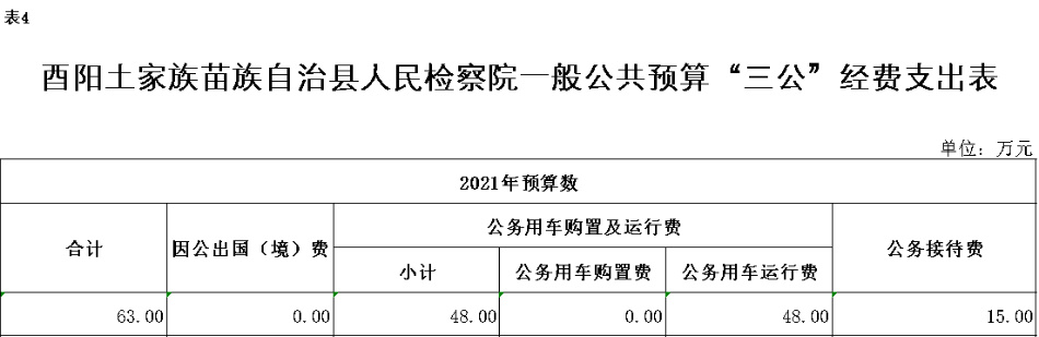 2021年“三公”经费预算63万元,与2020年持平。其中:因公出国(境)费用0万元,与2020年持平;公务接待费15万元,与2020年持平;公务用车运行维护费48万元,与2020年持平;公务用车购置0万元,与2020年持平。