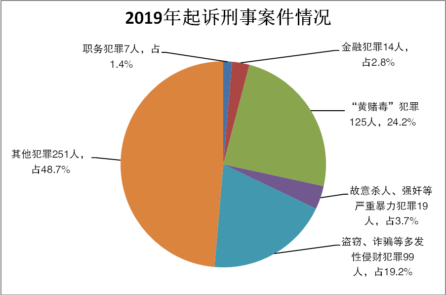 优中更优,做优刑事检察。认真履行刑事检察职能,严把案件事实关、证据关、程序关和法律适用关,确保案件质量。受理逮捕案件181件268人,批准(决定)逮捕146件229人,同比下降25.7%;受理移送审查起诉案件373件633人,本院提起公诉294件515人,同比上升13.1%。坚持不懈纠正防止冤假错案,对涉嫌犯罪但无逮捕必要、或证据不足的,依法不予批准逮捕35件39人;决定追捕1件1人,追诉漏罪漏犯27人次。加强对刑事立案、侦查、审判活动的监督,紧盯有案不立、有罪未究和不当立案、越权管辖等问题,监督立案1件,监督撤销案件23件,对侦查机关违法取证、适用强制措施不当等提出书面纠正意见28件次,同比上升42.8%。加强刑事执行监督,书面纠正刑罚执行和监管活动、监外执行中的违法行为28件;办理收监执行提请及裁定审查案件12件12人;办理控告、举报和申诉案件15件。抓紧抓实未成年人保护这一检察为民实事,紧盯最高检“一号检察建议”,推动社会各界联防联动切实保护未成年人健康成长机制的形成,与县教委协作开展“三月法治宣传月”暨“莎姐”进校园活动,选派39名干警到各乡镇学校担任法治副校长,开展校园法治讲座34场次。全年,对侵害未成年人犯罪起诉9件13人,对未成年人犯罪开展帮教工作,决定不起诉2件2人。