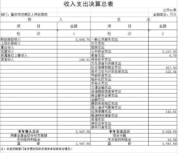 本院2017年度收入总计3,947.58万元,支出总计3,947.58万元。与2016年决算数相比,收支增加827.36万元、增长26.52%,主要原因:一是增人增资、政策性增资、购房补贴经费增加;二是2017年养老保险与职业年金清算后养老保险与职业年金支出增加;三是办案业务经费电子检务工程项目增加。