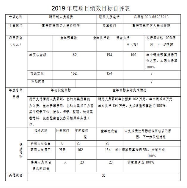 聘用人员项目绩效目标自评综述:根据年初设定的绩效目标,项目总体完成了2019年初设定的工作任务,项目得到有序开展,到年底完成项目的100%,资金拨付达100%。项目全年预算数为162万元,年中调减预算指标百分之五,执行数为154万元,完成调整预算的100%。主要产出和效果:一是按产出数量指标分析,解决聘用人员23人的薪酬、办公及差旅费等费用,保障办公办案需求,为办案提供良好的后勤保障,二是满意度完成情况分析,聘用人员协助办案部门办理案件4919件,服务社会满意度达100%按,按照单位制度管理考核,聘用人员出勤率达95%;年度《检察工作报告》在征求政协委员、人大代表意见上,检察工作赞成率达97%以上,取得了良好的社会效益和经济效益。