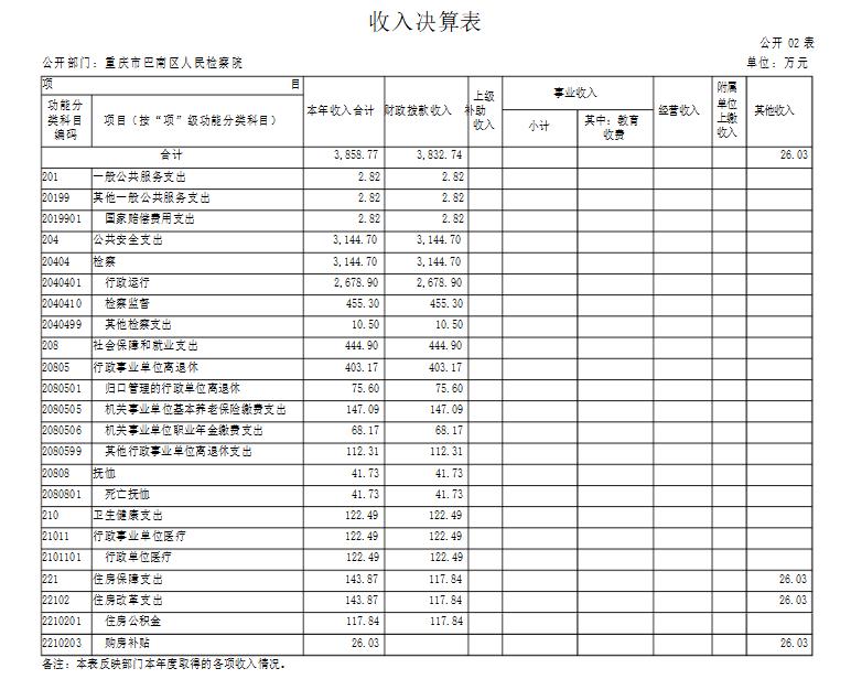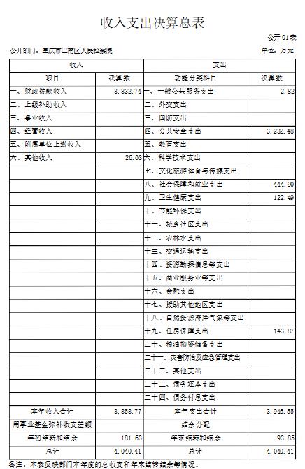 1.总体情况。2019 年度收入总计 4,040.41 万元,支出总计4,040.41 万元。收支较上年决算数增加 288.59 万元、增长 7.7%,主要原因:一是增人增资、政策性增资;二是年中追加国家赔偿、司法救助金、退休“中人”一次性补贴等专项经费;三是年底预发政府目标考核奖、退休健康休养费。