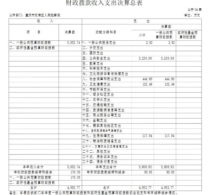 2019 年度财政拨款收、支总计 4,002.77 万元。与 2018 年相比,财政拨款收、支总计各增加 336.18 万元,增长 9.2%。主要原因:一是增人增资、政策性增资;二是年中追加国家赔偿、司法救助金、退休“中人”一次性补贴等专项经费;三是年底预发政府目标考核奖、退休健康休养费。