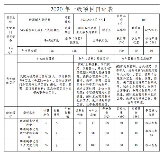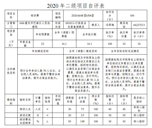 根据预算绩效管理要求,本部门对5个一级项目和9个二级项目开展了绩效自评,其中,以填报目标自评表形式开展一级项目自评1项,涉及资金128万元;以填报目标自评表形式开展二级项目自评1项,涉及资金16.1万元,从评价情况来看采取了积极有效的措施,达到了绩效目标,有效保证了本单位正常运行,提高了办案水平。
