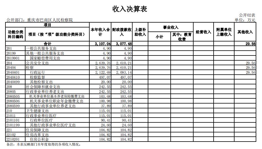 2.收入情况。2020 年度收入合计3,107.04万元,较上年决算数减少751.73万元,下降19.5%,主要原因:一是职侦转隶人员经费划转减少;二是2019年底预发政府目标考核奖励,2020年没有预发政府目标考核奖励;三是2019年办公楼搬迁增加一次性搬家运行经费。其中:财政拨款收入 3,077.48万元,占99%;其他收入 29.56万元,占1%。此外,年初结转和结余93.85万元。