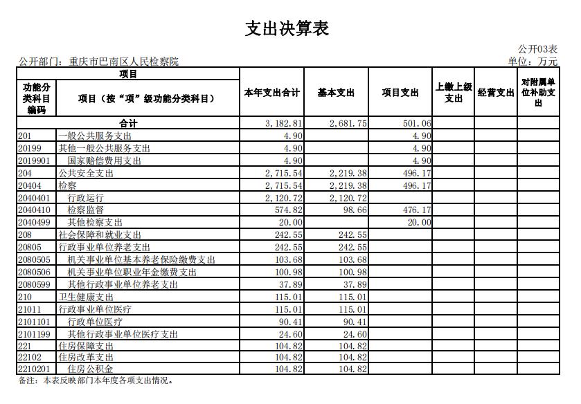 3.支出情况。2020 年度支出合计3,182.81万元,较上年决算数减少763.74万元,下降19.4%,主要原因:一是职侦转隶人员经费划转减少;二是2019年底预发政府目标考核奖励,2020年没有预发政府目标考核奖励;三是2019年办公楼搬迁增加一次性搬家运行经费。其中:基本支出 2,681.75万元,占84.3%;项目支出 501.06万元,占15.7%。