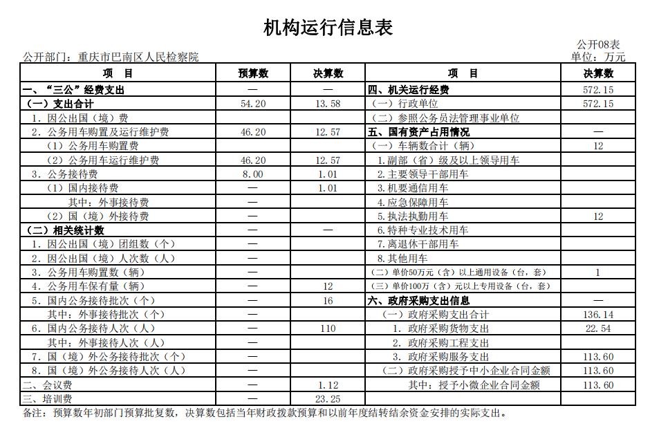 (一)机关运行经费情况说明。2020年度本部门机关运行经费支出572.15万元,机关运行经费主要用于开支办公费、公务车运行维护费、邮电费、维修费、信息网络购置更新等费用。机关运行经费较上年决算数减少28.45万元,下降4.7%,主要原因是职侦人员经费划转定额差旅费减少。