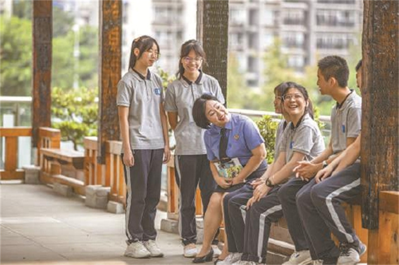 9月20日,在重庆市第三十七中学,梅玫与学生在课间交流。 新华社记者黄伟摄