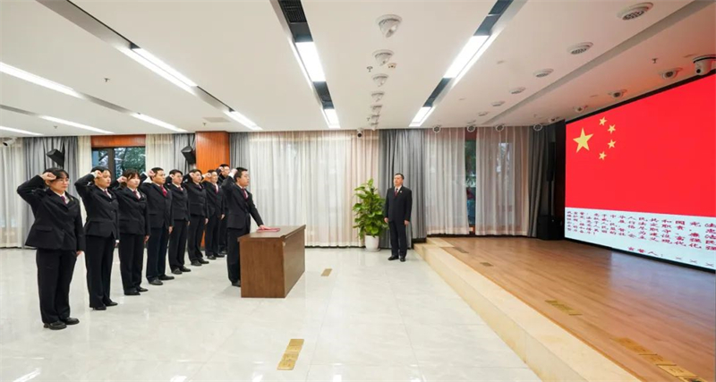 12月4日上午10时,随着国歌响起,两江地区检察院宪法宣誓仪式正式开始。本次宣誓仪式由该院检察长黄常明监誓,领誓人王东海左手抚按《中华人民共和国宪法》,带领今年新晋升、新入职的9名检察干警面向国旗列队肃立,整齐划一地举起右拳许下了铮铮誓言。
