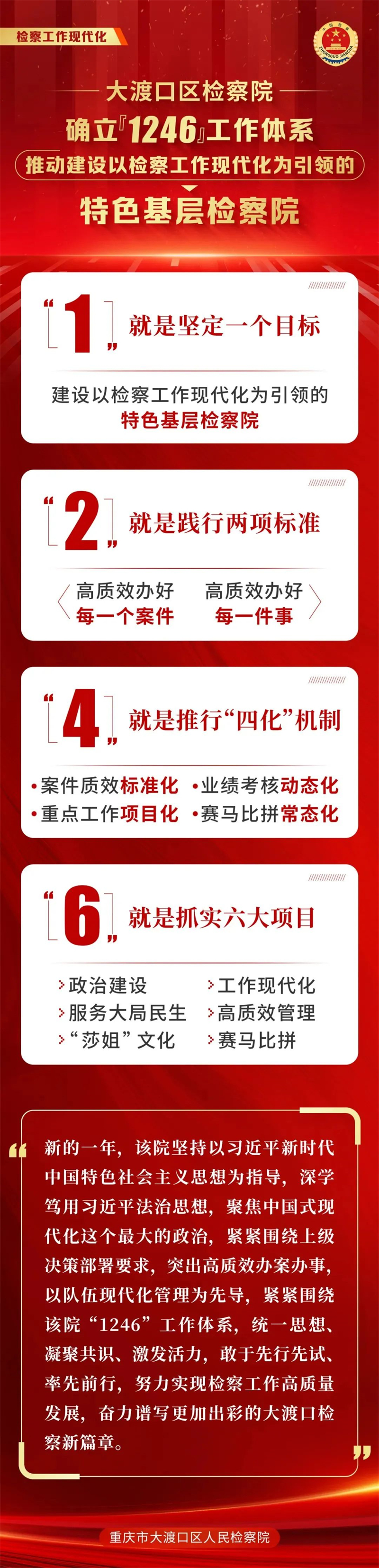 大渡口区检察院党组着力在理清思路谋发展上下功夫,深入学习全国、全市检察长会议精神,结合大渡口区院实际,经充分讨论酝酿,印发了《关于加强队伍现代化管理推动建设以检察工作现代化为引领的特色基层检察院的意见》,初步确立了“1246”工作体系。