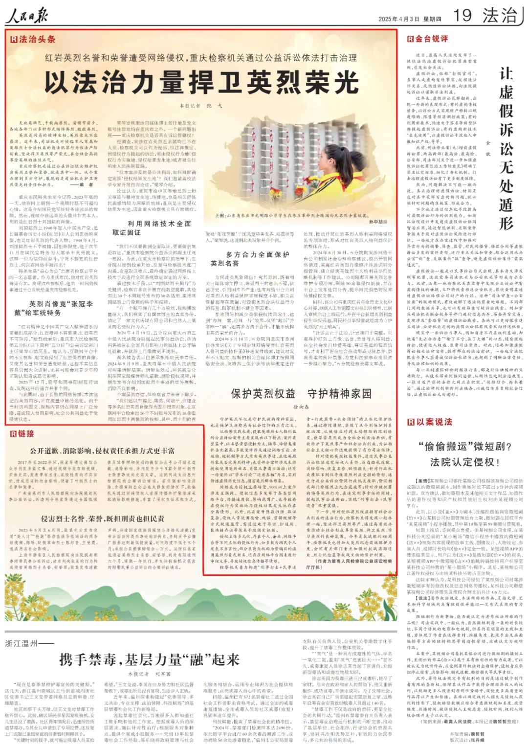 2025年4月3日,《人民日报》第19版“法治头条”专栏刊登《红岩英烈名誉和荣誉遭受网络侵权,188体育