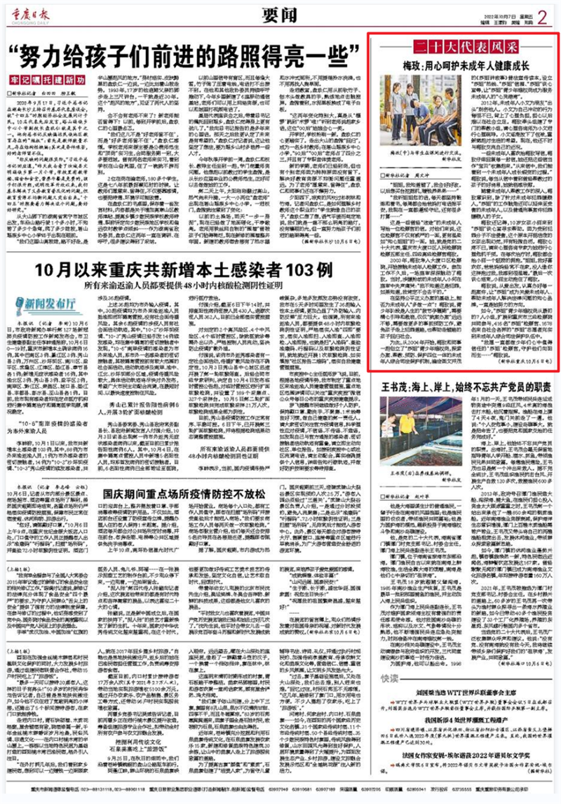 今天(7日),重庆日报转载了新华社报道——《梅玫:用心呵护未成年人健康成长》,讲述了二十大代表——大渡口区人民检察院检察五部主任、四级高级检察官梅玫的故事。