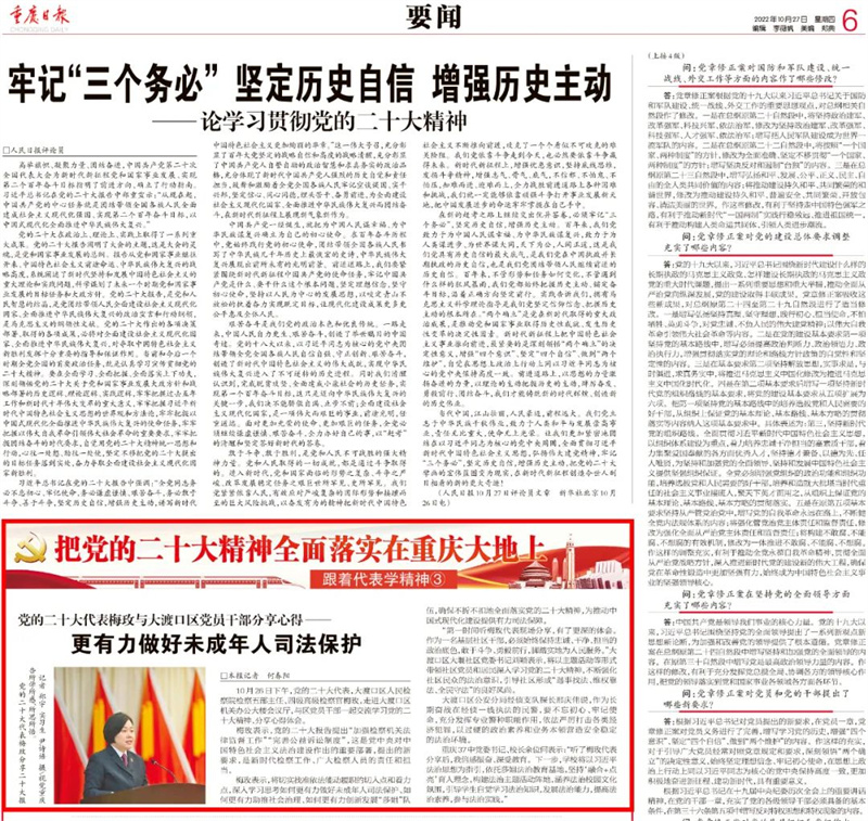 “第一时间听梅玫代表现场分享,有了更深的体会。作为一名基层社区干部,必须始终保持忠诚、干净、担当的政治底色,敢于斗争、勇毅前行,脚踏实地为人民服务。”大渡口区大堰社区党委书记刘颖表示,将以主题活动等形式带领社区党员和居民深入学习党的二十大精神,不断强化社区民众的法治意识,引导社区形成“遇事找法、维权靠法、全民守法”的良好风尚。