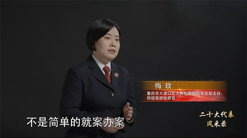 2022年12月1日,新华网承办的中共中央组织部“共产党员”官方微信公众号发布了《二十大代表风采录 青春守护者》视频,详细介绍了党的二十大代表、重庆市大渡口区人民检察院检察五部主任、四级高级检察官梅玫的故事。