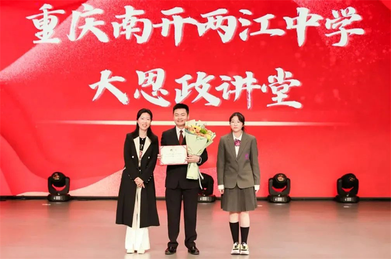讲座最后,重庆南开两江中学副校长李南兰代表学校邀请罗文磊作为学校的法治教育指导师,并为他颁发“法治辅导员”聘书。