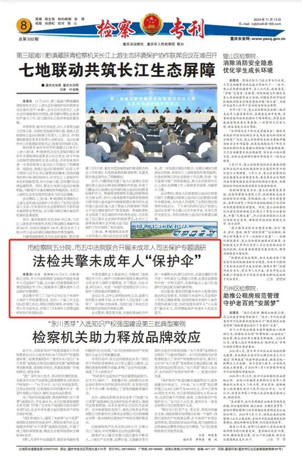 2024年11月13日,《重庆法治报》第8版刊登《188体育 五分院、市五中法院联合开展未成年人司法保护专题调研 法检共擎未成年人“保护伞”》一文,内容如下: